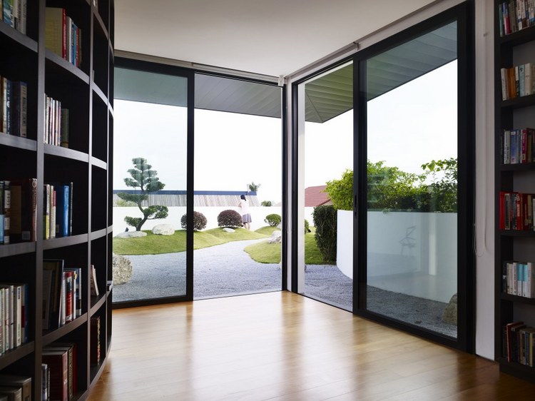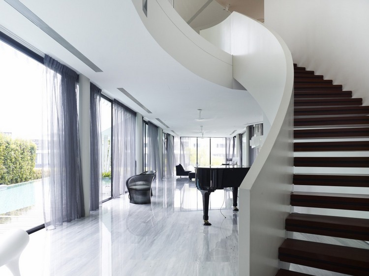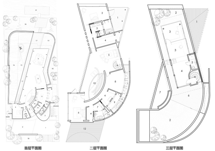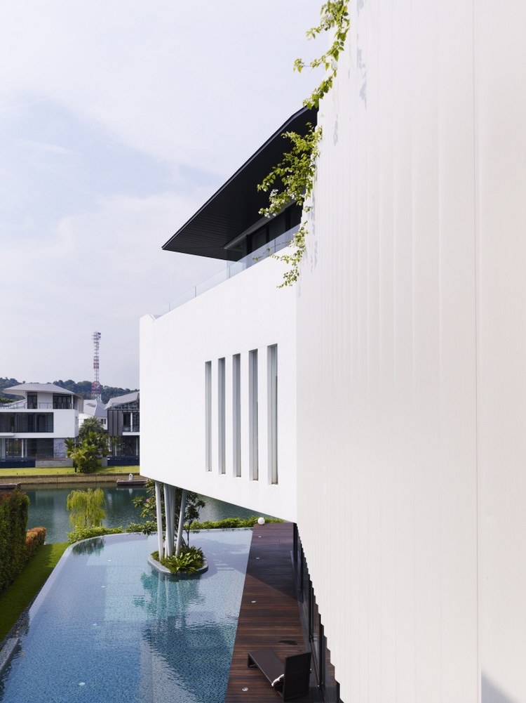 別墅設(shè)計(jì),13 Cove Grove別墅(13 Cove Grove)13 Cove Grove別墅建在一處狹長(zhǎng)的基地上,正對(duì)著一小片水域。為了使居住者最大化地欣賞到水域的風(fēng)景,設(shè)計(jì)團(tuán)隊(duì)將別墅裝修設(shè)計(jì)成一個(gè)類(lèi)似回力鏢的體量,從而使臥室正面像這片美景。這樣的布局安排,使這個(gè)游泳池的一邊一直延伸至一層的一側(cè)。另外,團(tuán)隊(duì)還在一層的主要區(qū)域設(shè)計(jì)了一個(gè)連續(xù)性的空間,進(jìn)入這里后,人們可以看到筆直的水域獲得更加連續(xù)的視野。與水域相連的是一個(gè)線性的木質(zhì)甲板設(shè)計(jì),一直從房間內(nèi)部延伸出來(lái),視覺(jué)上增加了房屋的面積。除了基本的回力鏢設(shè)計(jì),團(tuán)隊(duì)至少還采用了另外兩種布局的變體,從立面設(shè)計(jì)看,設(shè)計(jì)師以完全不同的方式設(shè)計(jì)了不同兩側(cè)的回力鏢體量。面向街角的一層,將透明與封閉設(shè)計(jì)交叉使用,而二層則完全使用了實(shí)體墻進(jìn)行立面設(shè)計(jì)。靠向水域的一層則采用了相對(duì)開(kāi)放的透明玻璃設(shè)計(jì),增強(qiáng)了可視度。一層主要作為公共活動(dòng)空間,二層為臥室區(qū)域,而與屋頂花園相連接的三層則主要作為工作室使用。