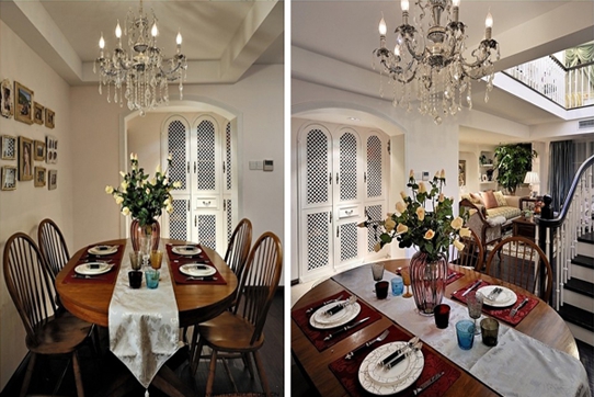 餐廳位置位于二樓上樓處,站在餐廳的一角剛好可以看到在整個別墅的大致結構,客廳,以及上二樓的樓梯位置 。餐廳與廚房也是通過鏤空型的門隔開,頗有幾分歐式風格的優雅之美。