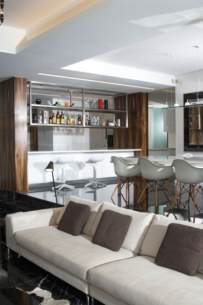 這個4500平方英尺的房子建在8000平方英尺的一個緩坡上降落。房子的方向是特殊的,因為它并不能面對服務道路,但有一個45度的傾斜。它能達到兩個目標:第一,寬度和建筑物的大小是優化;其次,它確保隱私的人。建筑結構保存雖然增加了一些微小的擴展。這房子被漆成白色,這樣一個能欣賞強壯的架構形式。黑暗的鋁框玻璃窗被安裝在眾議院。以補充現代形式、景觀建筑都保持清潔。蓄意使用戲劇性的Serralunga盆與Zamia紙板棕櫚成為焦點的花園。