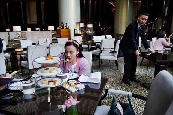 上海朗廷酒店,一名年輕的中國女孩在享用茶點。
