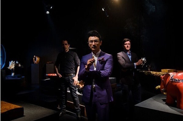 中國企業家塔羅斯(中)與他的兩名雇員——來自英國的托比·柯林斯(右)和來自美國的梅爾斯在工作室內合影。