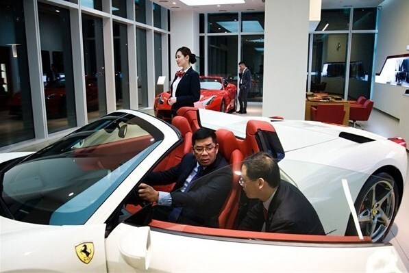 浦東世紀大道一間豪車展廳內,一位男士試駕報價450萬人民幣的法拉利458 Spider。