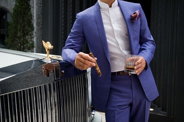 中國企業家塔羅斯拿著雪茄站在自己的座駕——一輛勞斯萊斯旁。